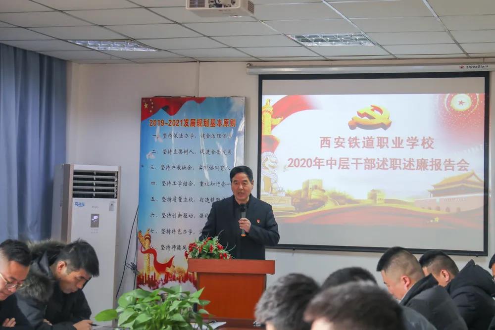 为进一步加强我校领导班子建设,提高中层干部履岗尽职的能力和水平,检查领导干部落实党风廉政建设责任制和执行廉洁自律各项规定的情况,根据《西安铁道职业学校干部选拔任用条例》《西安铁道职业学校、中共西安铁道职业学校支部委员会关于中层干部述职述廉的意见》相关要求,按照学校年度工作部署,于2021年1月2日下午在行政楼二楼会议室召开中层干部述职述廉专题汇报会。全体中层干部、教职工代表参加会议。
