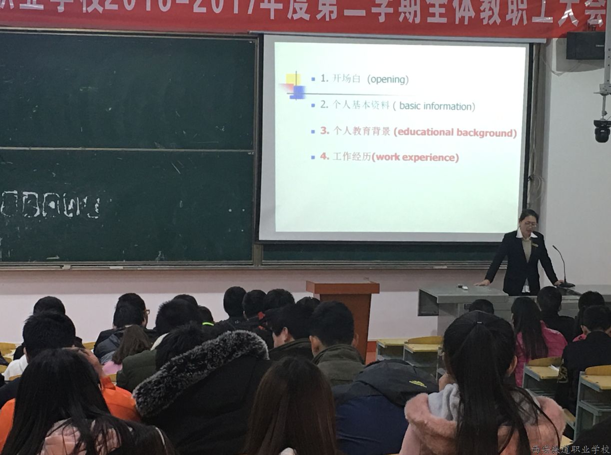 为了使我校即将就业的学生能够在应聘过程中展示完美的自已,2017年3月6日至3月8日16:20在教八楼8F-J1教室,由教务处王子辛、张晓玲、马丽三位老师对我校115级学生分别做了“怎样做好自我介绍”、“如何用英语做自我介绍”和“如何制作简历”方面的知识讲座。